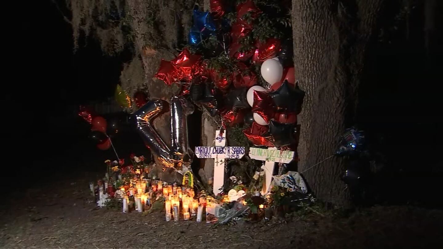They gathered near the crash site, bringing balloons, candles, and pictures of the three boys, laying them around the tree where they crashed.