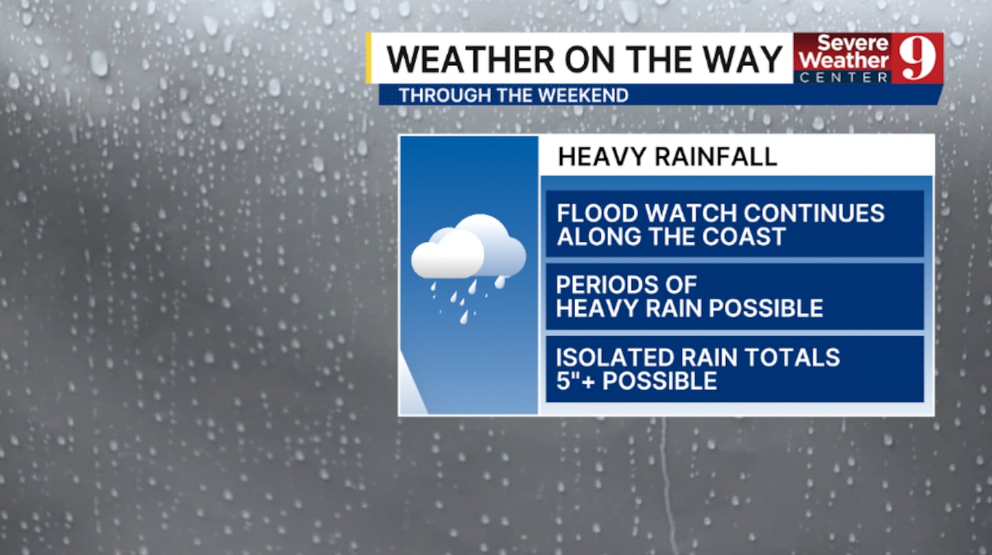 A Flood Watch continues for coastal areas through Sunday, where heavy rainfall may lead to flooding concerns.