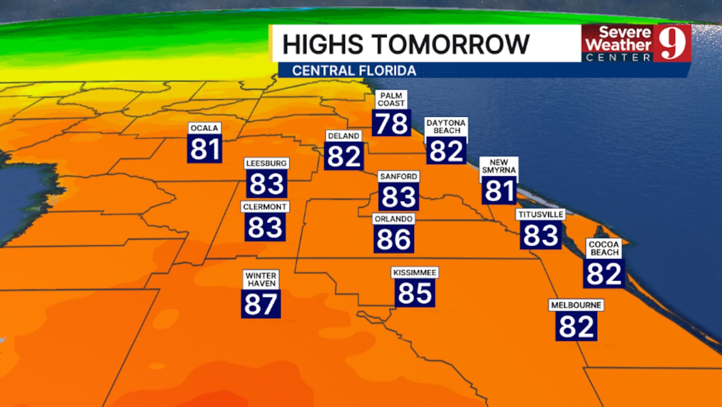 Behind the system, cooler and drier air moves in for Tuesday. A few light showers will remain possible at the coast, with temperatures on Tuesday in the low 80s.