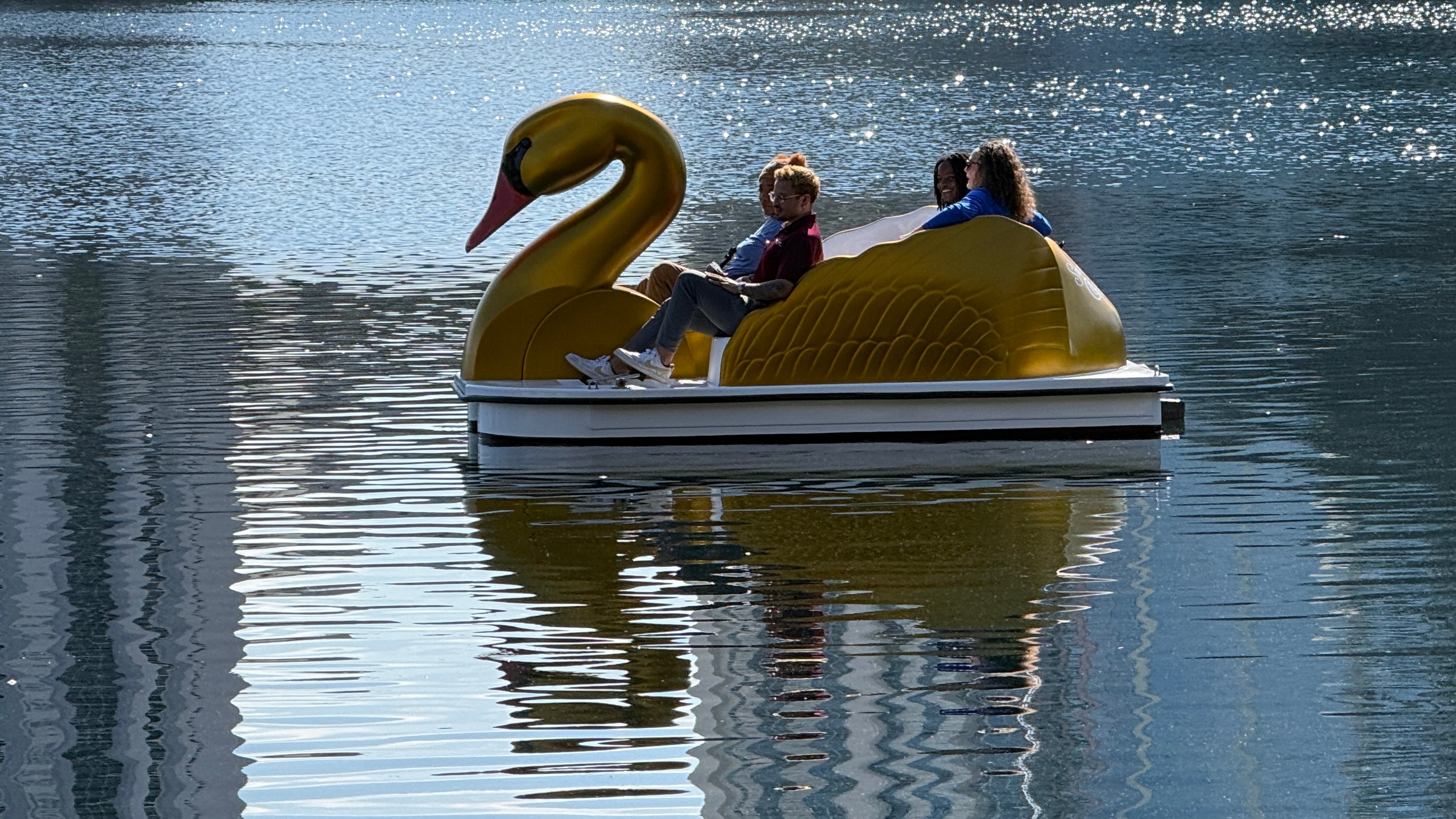 The swan boats symbolize togetherness, bringing smiles and beautiful sights to visitors.