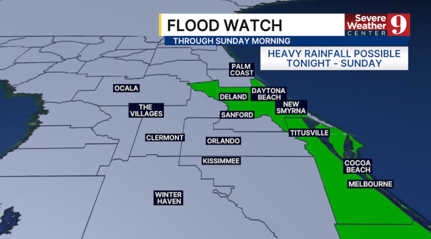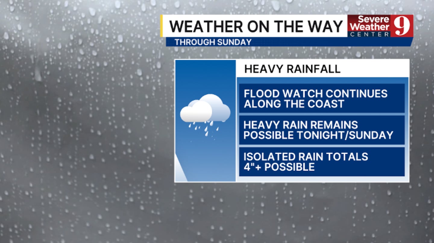 A Flood Watch continues for the coast through Sunday morning, where flooding could become a concern.