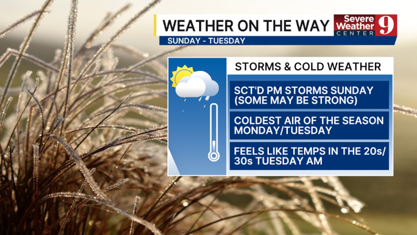 Stay with Severe Weather Center 9 for the latest on the storm threat Sunday and the chilly blast for next week.