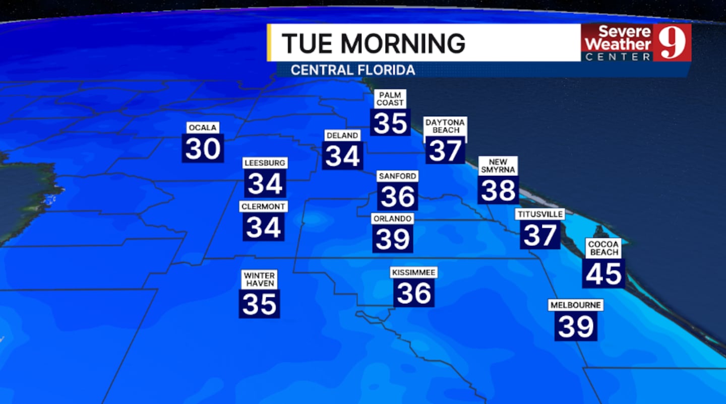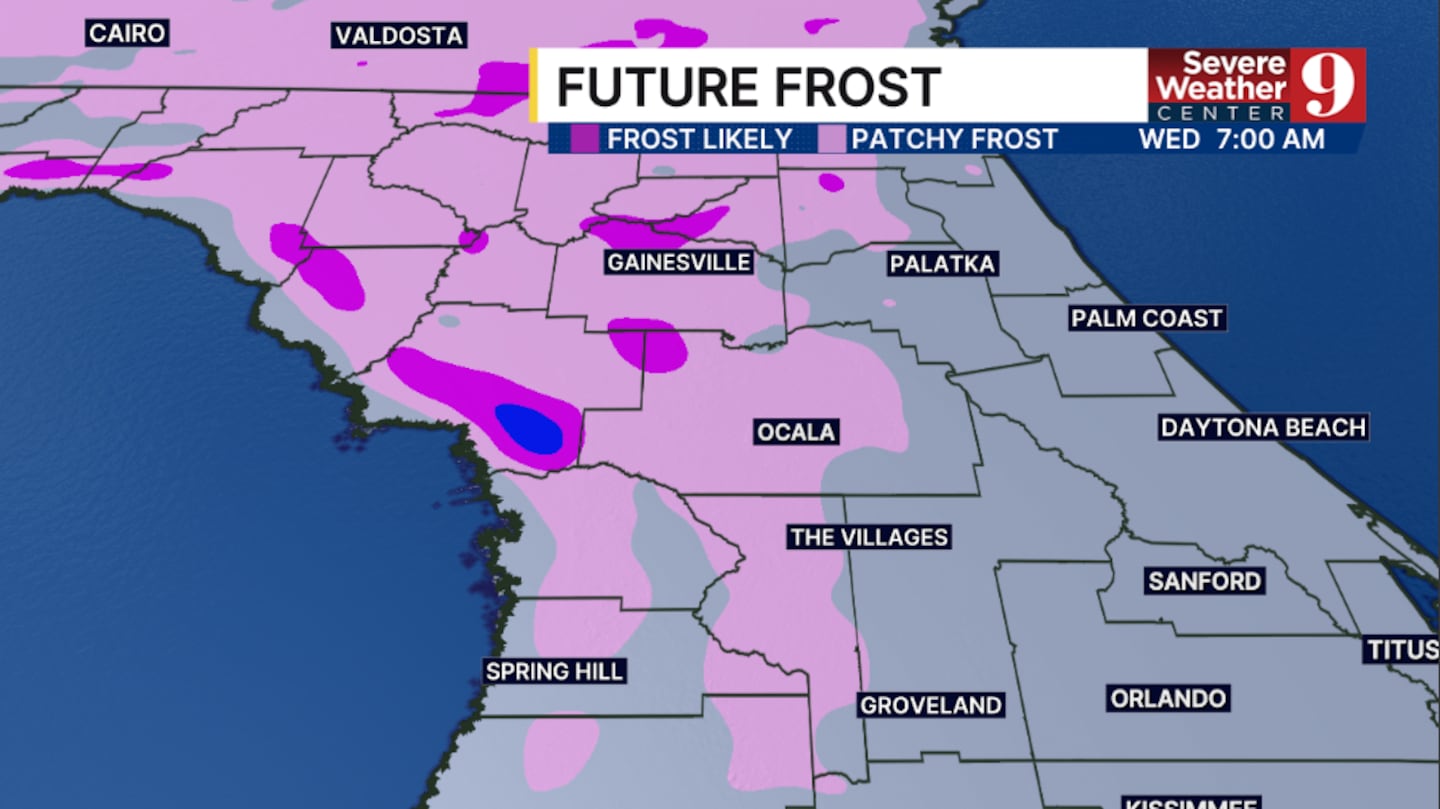 Tuesday night could be the first frost of the season for some in the area. Winds will lighten, which could allow frost to form in areas west and northwest of Orlando. Morning lows will be in the mid-40s.