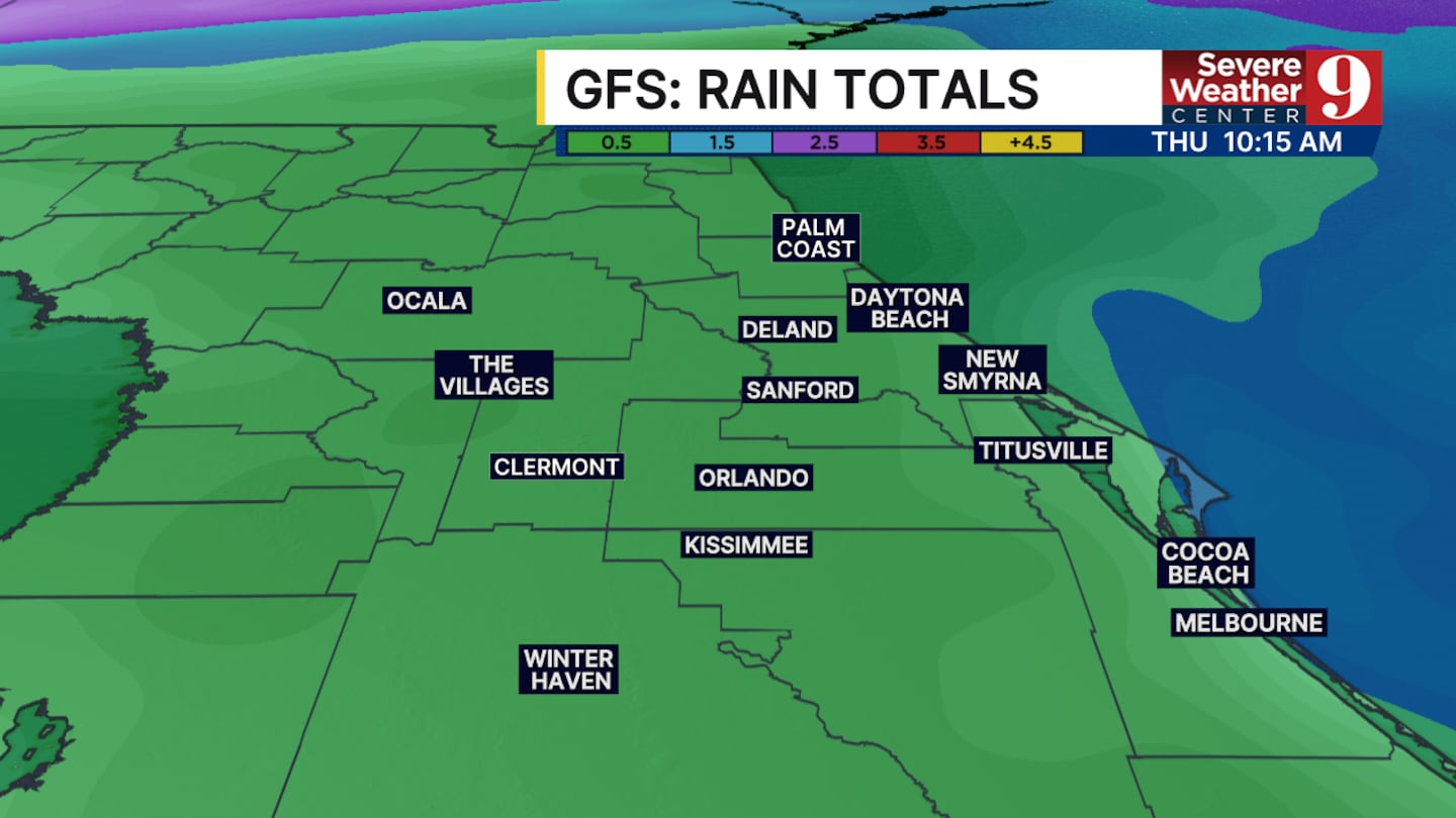 A cold front is moving into central Florida, increasing the chances of rain slightly. The most likely time for rain will be on Tuesday, as the front passes, potentially causing up to half an inch of rainfall.